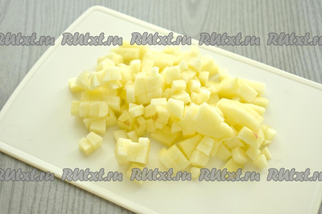 Очищаем яблоко от кожуры и семян. Нарезаем яблоко на маленькие кубики.