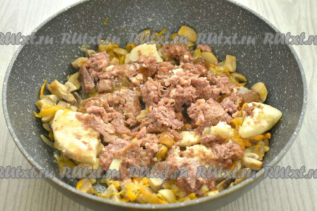 Затем добавляем в сковороду тушёнку вместе с жиром, перемешиваем и готовим, периодически помешивая, 5 минут.