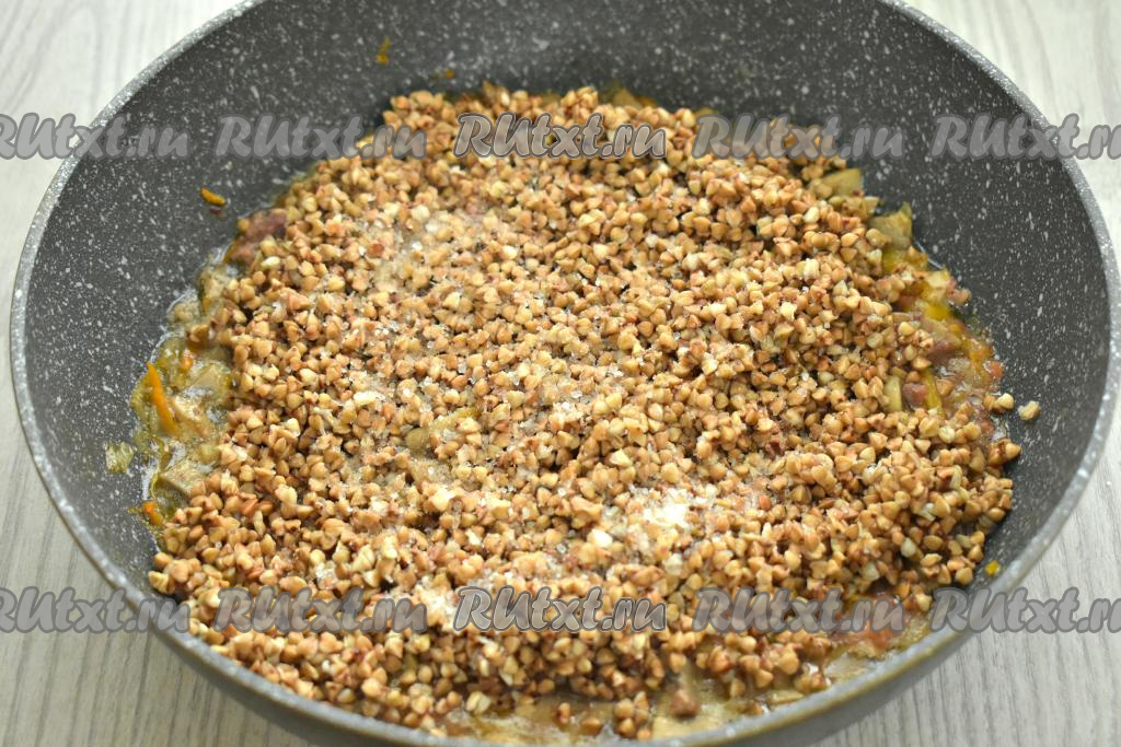 Выкладываем в сковороду подготовленную гречку, по вкусу солим и перчим.
