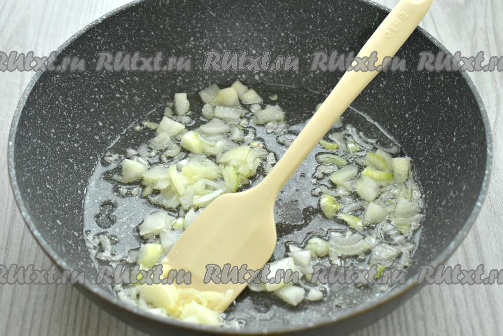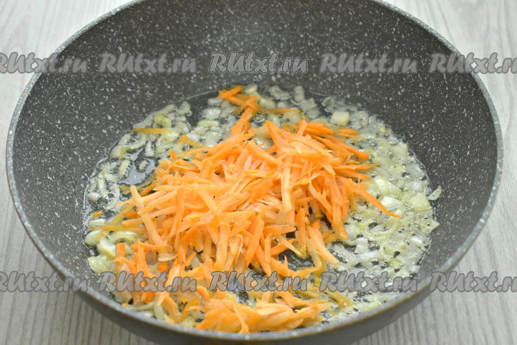 К луку, обжаренному до прозрачности, добавляем морковку, натёртую на крупной тёрке, перемешиваем овощи и обжариваем, периодически перемешивая, 4-5 минут (до мягкости моркови).