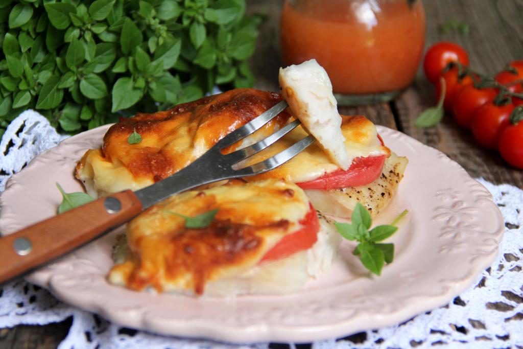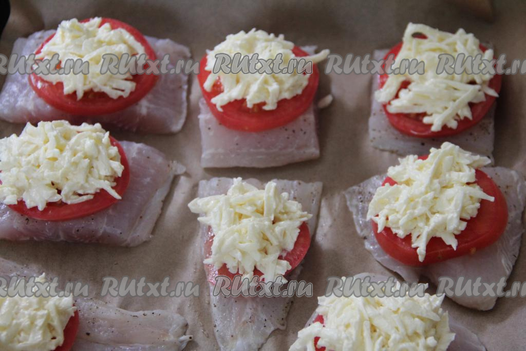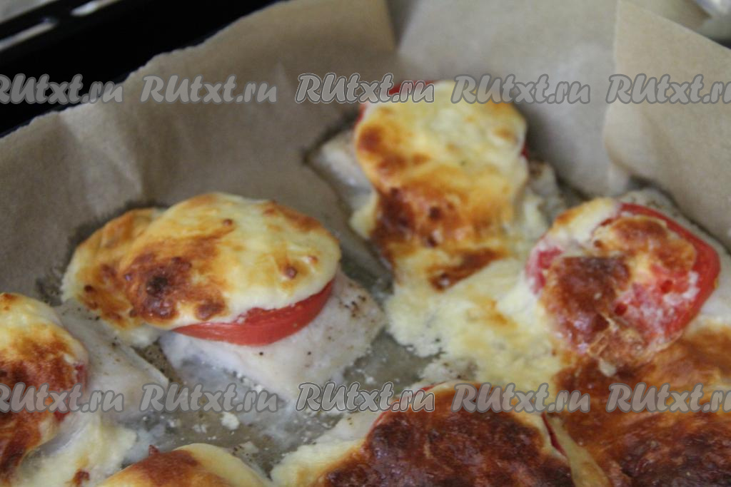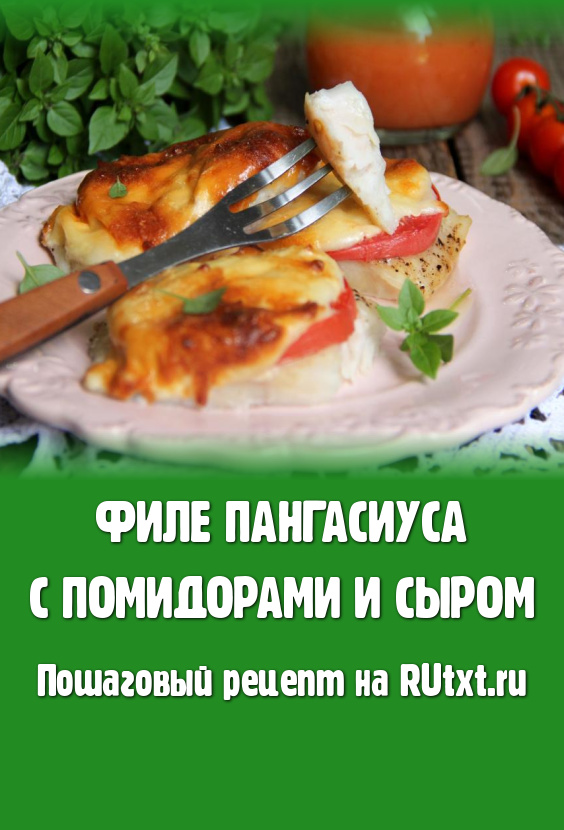 Поместить противень в духовку, разогретую до 180 градусов, запекать филе пангасиуса под помидорами и сыром минут 30.