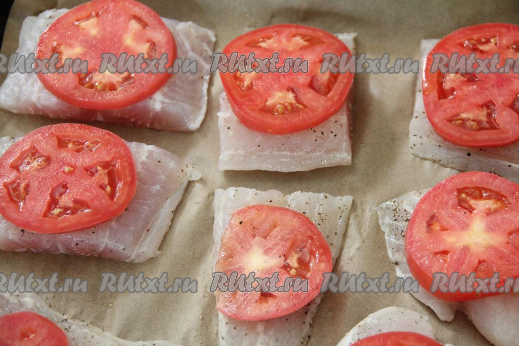 На каждый кусочек рыбы выложить по кружочку помидора.
