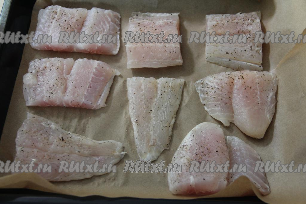 Нарезать филе пангасиуса на порционные кусочки, посолить и поперчить по вкусу.