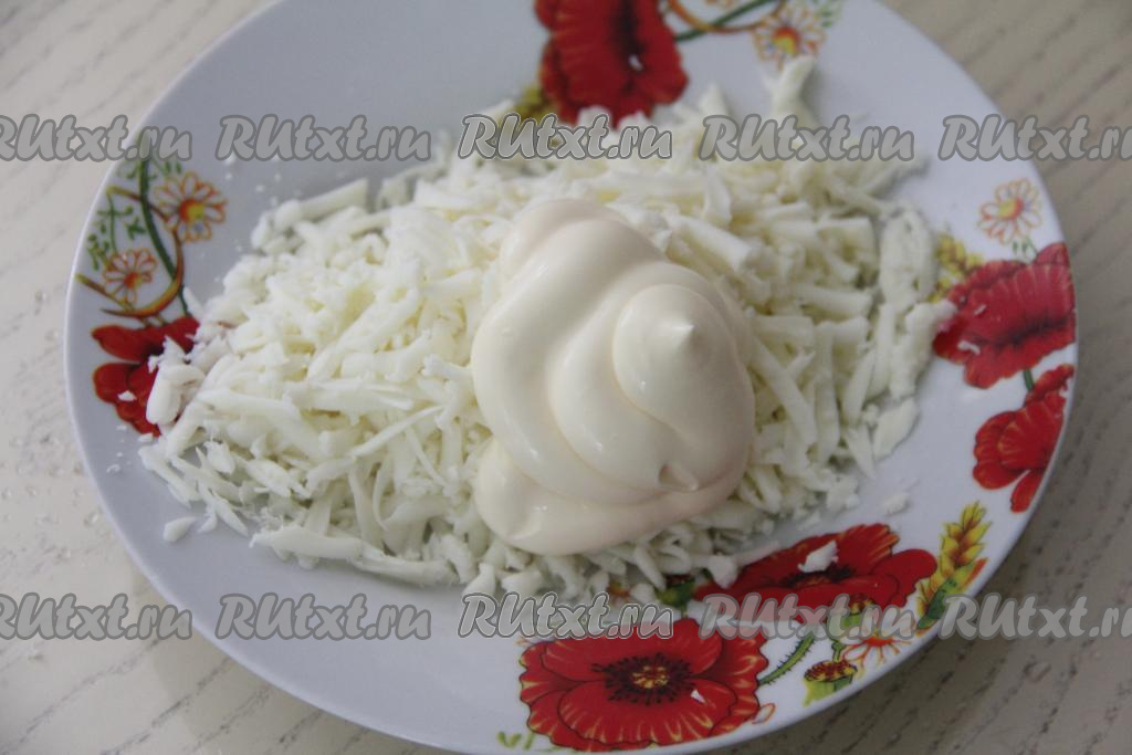 Сыр (у меня - сулугуни) натереть на крупной тёрке в глубокую тарелку, добавить майонез, перемешать.
