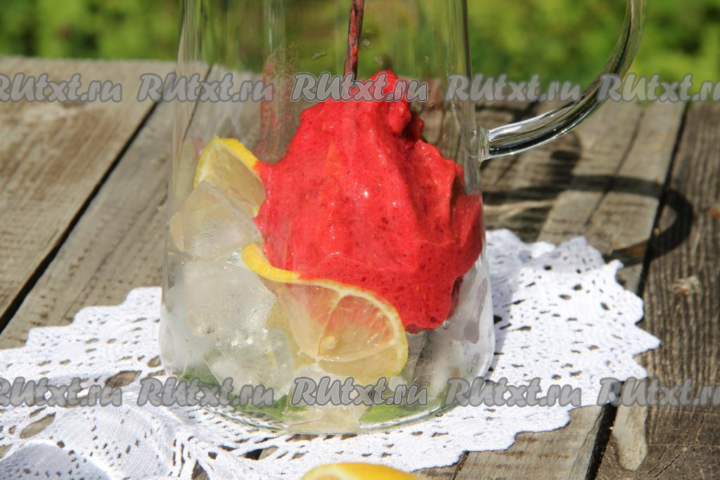 Пробить ягодную массу до получения однородного пюре (на это потребуется 1-2 минуты). Если нет измельчителя, можно пробить малину с сахаром и лимонным соком до однородности с помощью погружного блендера. В графин выложить тонко нарезанные дольки лимона, можно добавить ещё вымытые листики мяты.