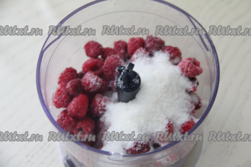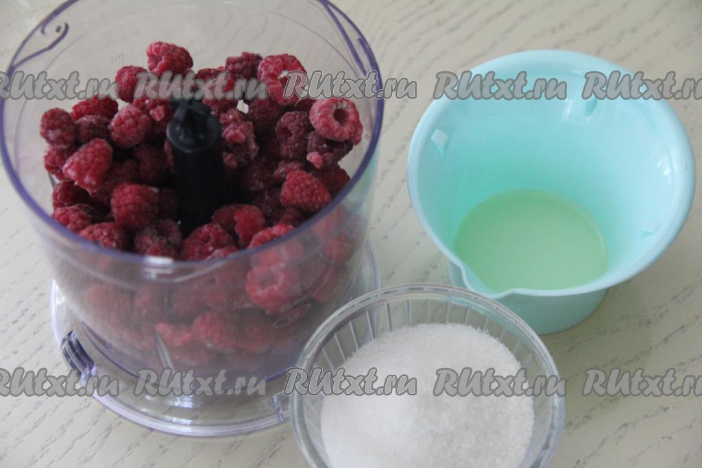 Я готовила лимонад из свежих ягод. Для того чтобы лимонад получился хорошо охлаждённым, я поместила подготовленную свежую малину в морозилку на 1 час. Затем переложить малину в чашу измельчителя. Выдавить туда же сок из половины лимона.