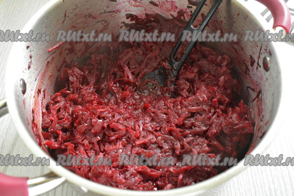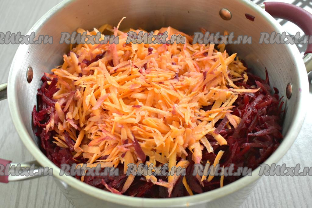 Свеклу и морковку натираем на крупной тёрке, перекладываем в кастрюлю с толстым дном.