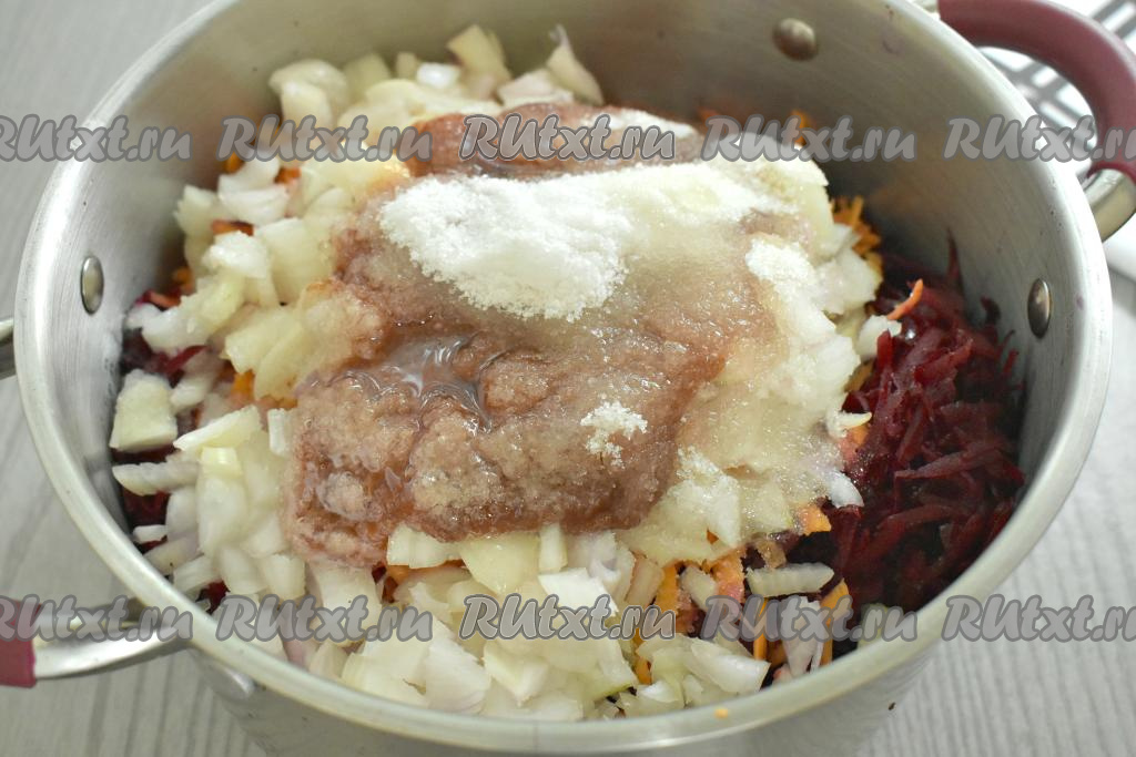 Доводим содержимое кастрюли, периодически перемешивая, до кипения, убавляем огонь. Тушим овощи 45 минут, иногда помешивая. Затем в заправку для борща вливаем уксус, хорошо перемешиваем. Через 2 минуты выключаем огонь.