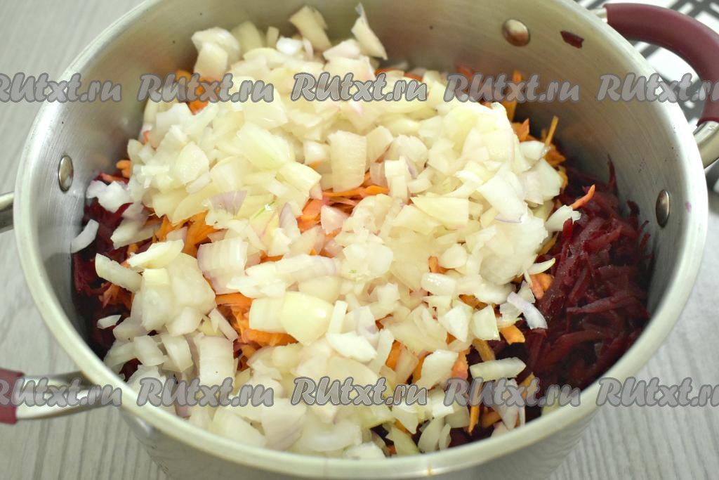 Репчатый лук нарезаем на небольшие кусочки, отправляем в кастрюлю к свекле и моркови.