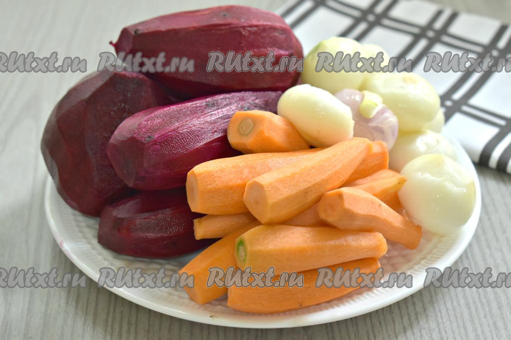 Для такой заготовки я обычно использую маленькие корнеплоды или непривлекательные. Очищаем свеклу, репчатый лук и морковку. В ингредиентах указан вес очищенных овощей.
