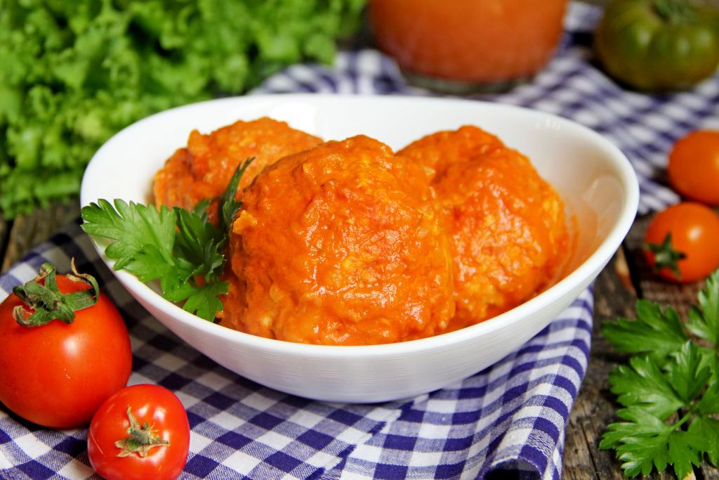 Разделить получившийся фарш на 8 равных частей, сформировать круглые тефтели, выложить их в сковороду. Для получения соуса в отдельной ёмкости соединить томатную пасту, сметану и 200 миллилитров воды, немного подсолить, перемешать томатно-сметанный соус венчиком.