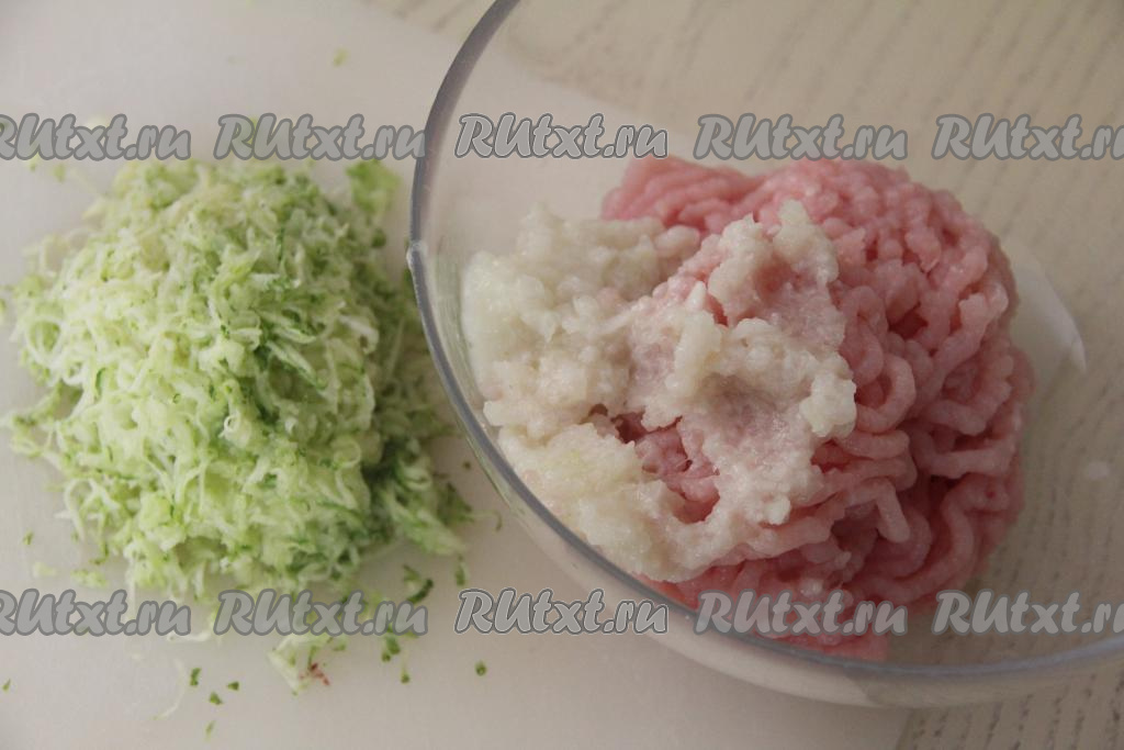 Натёртый кабачок руками отжать от лишнего сока (отжатый сок нам не понадобится). Кабачковую массу, отжатую от сока, добавить в миску с фаршем и луком.