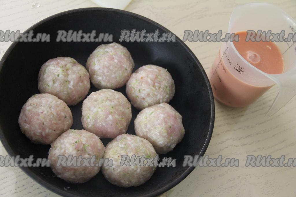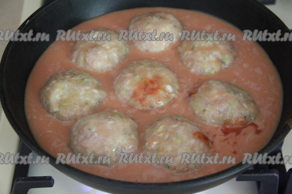 Влить получившийся томатно-сметанный соус в сковороду, он должен покрывать куриные тефтели с кабачком, как минимум, на 2/3, поставить на огонь. Как только соус закипит, убавить огонь до минимума, накрыть сковороду крышкой.