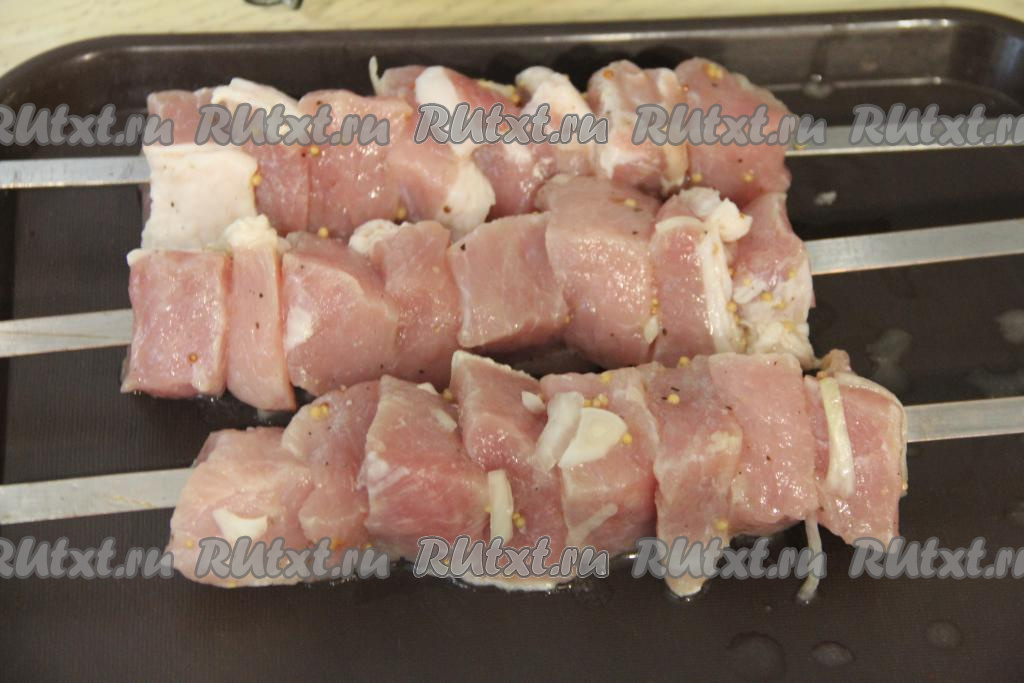 Кусочки свинины, замаринованные в пиве, нанизать на шампуры.