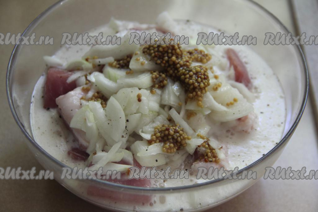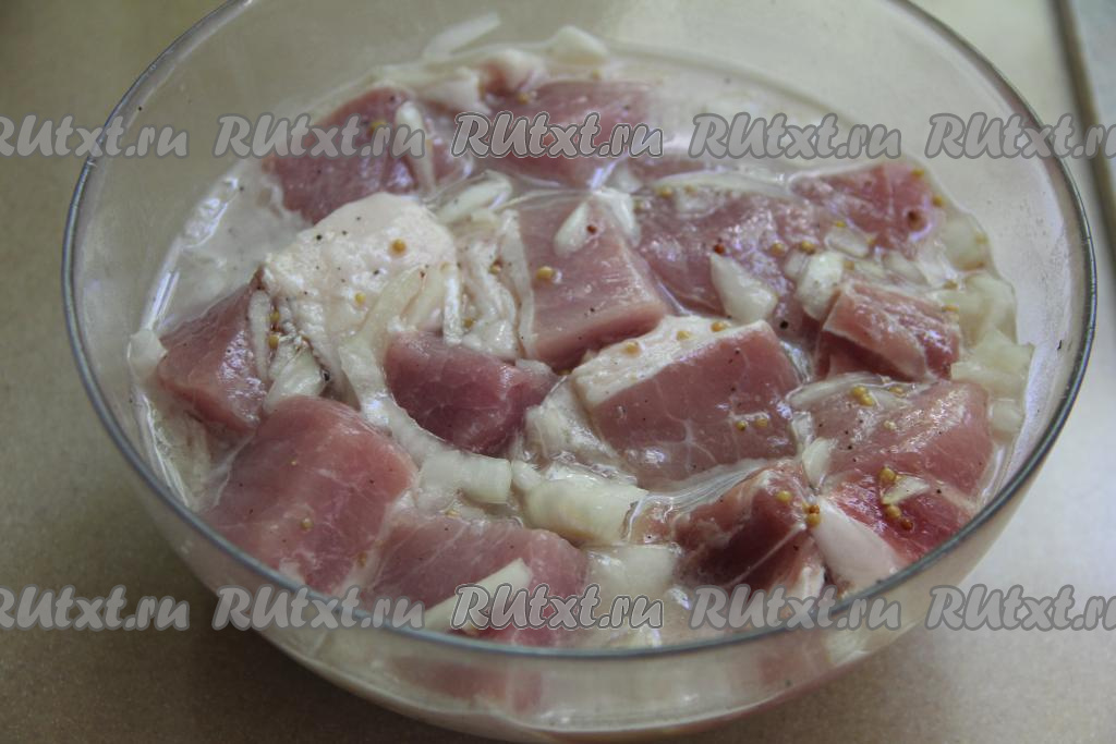 В объёмной миске соединить кусочки свинины и лук, добавить соль, чёрный молотый перец и горчицу.