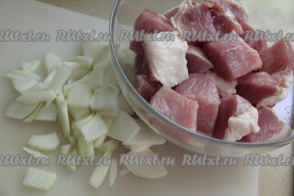Нарезать мякоть свинины на кусочки, удобные для жарки шашлыка. Лук очистить, промыть и нарезать на тонкие четверть кольца (или полукольца).