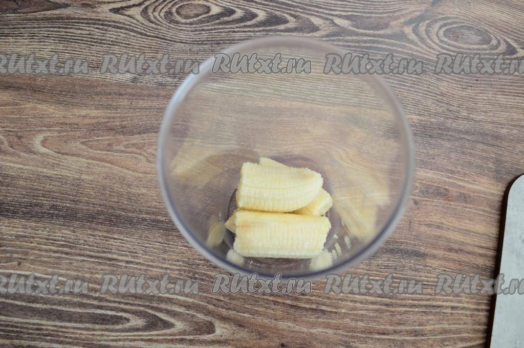 Банан очистить от кожуры. В чашу погружного блендера выложить банан, разломанный на кусочки.