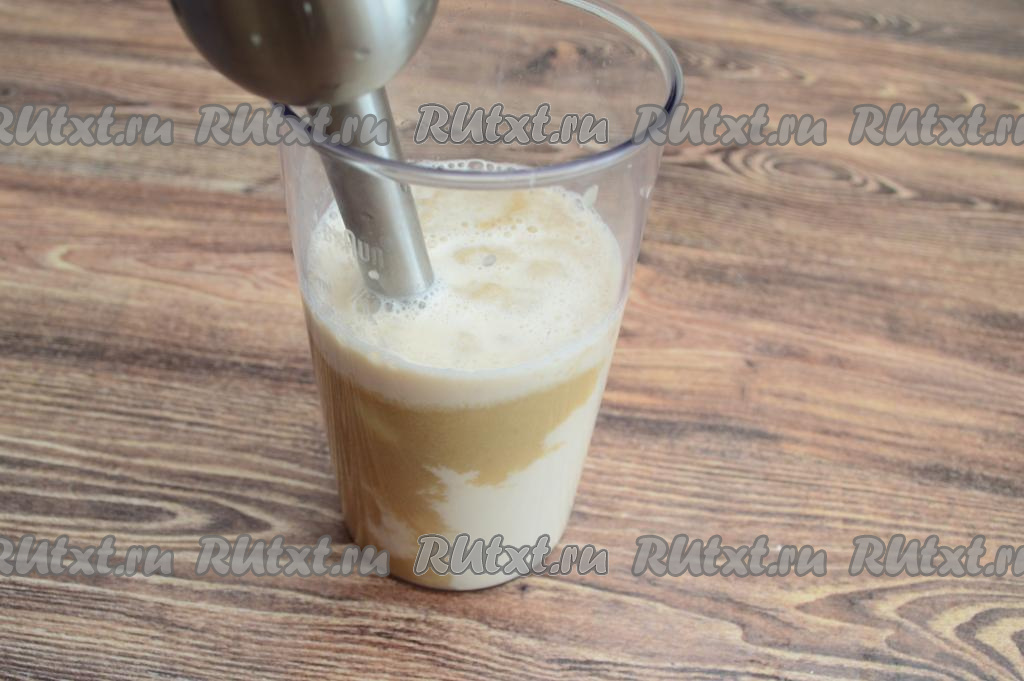 В чашу с пюре из груш и банана влить молоко, пробить смузи блендером до однородности.