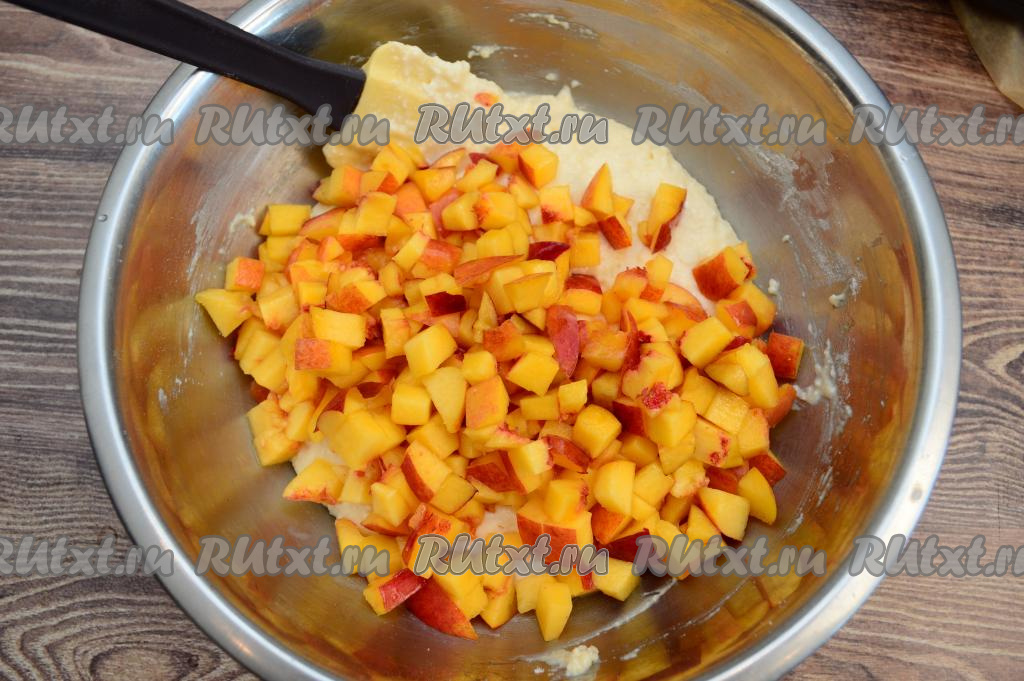 Из нектаринов удалить косточки. Нарезать нектарины на небольшие кубики и переложить в миску с творожным тестом.