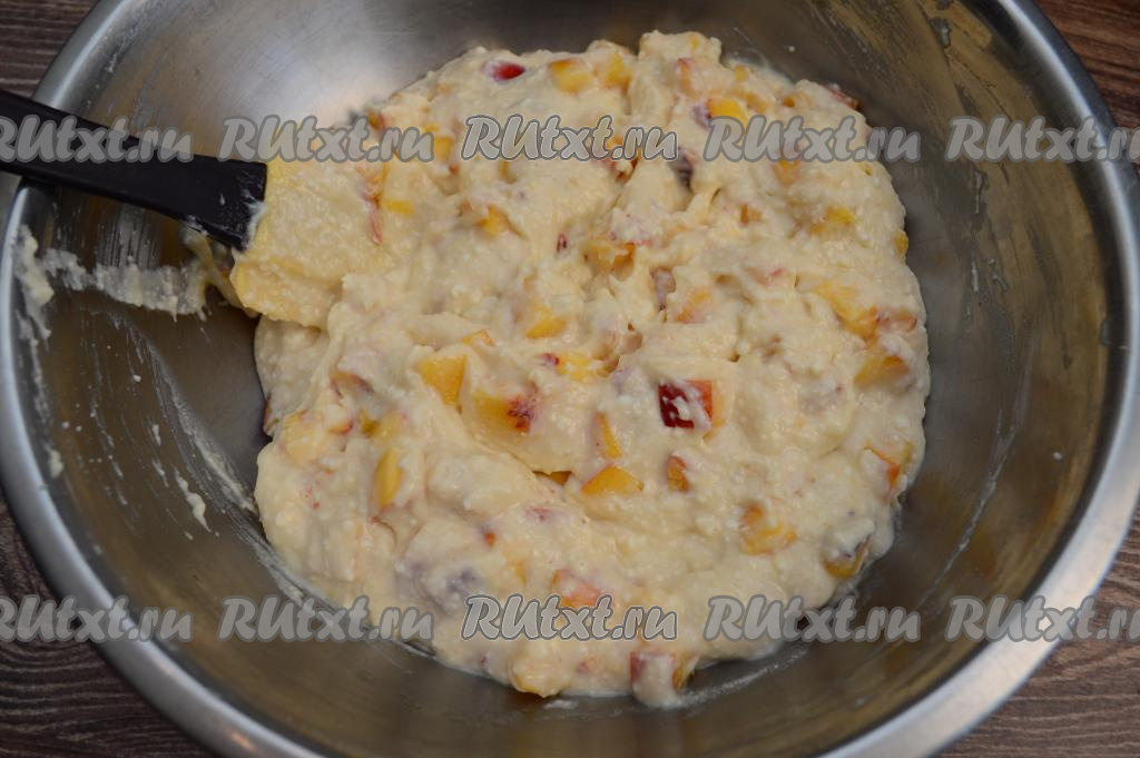Вмешать кусочки нектаринов в тесто при помощи лопатки, распределяя фрукты по всему тесту.