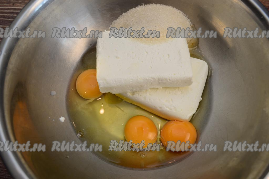 В глубокой миске соединить творог, сахар, яйца и соду.