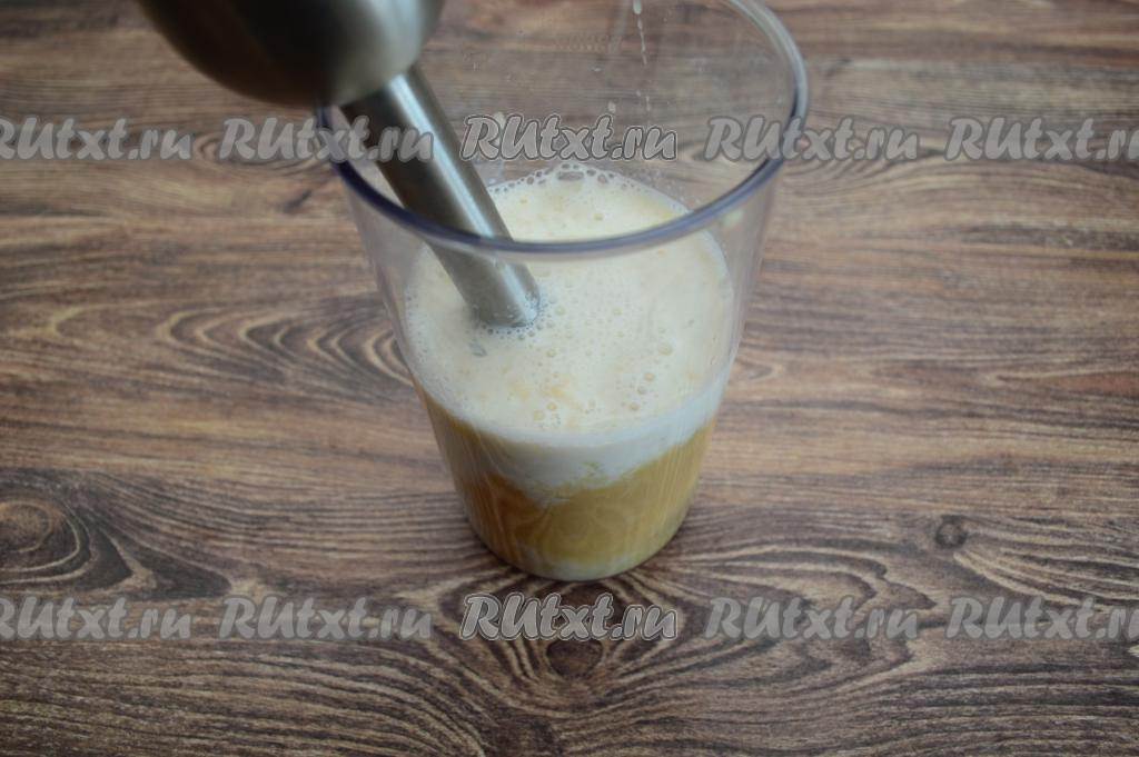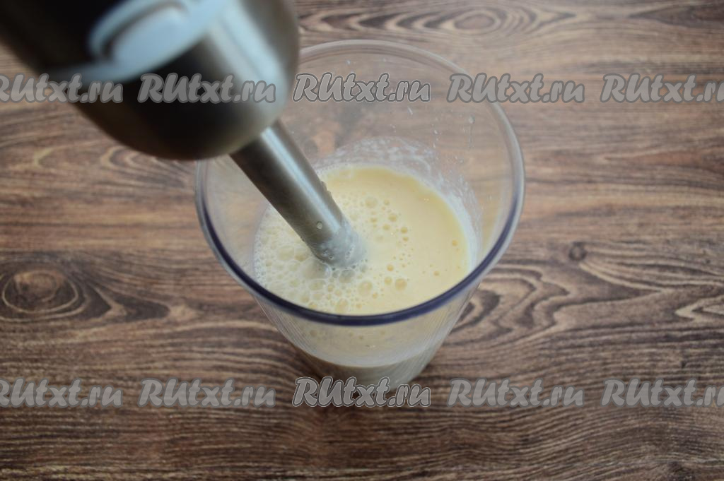 Затем в чашу с фруктовым пюре влить молоко и ещё раз пробить смузи до однородности блендером.