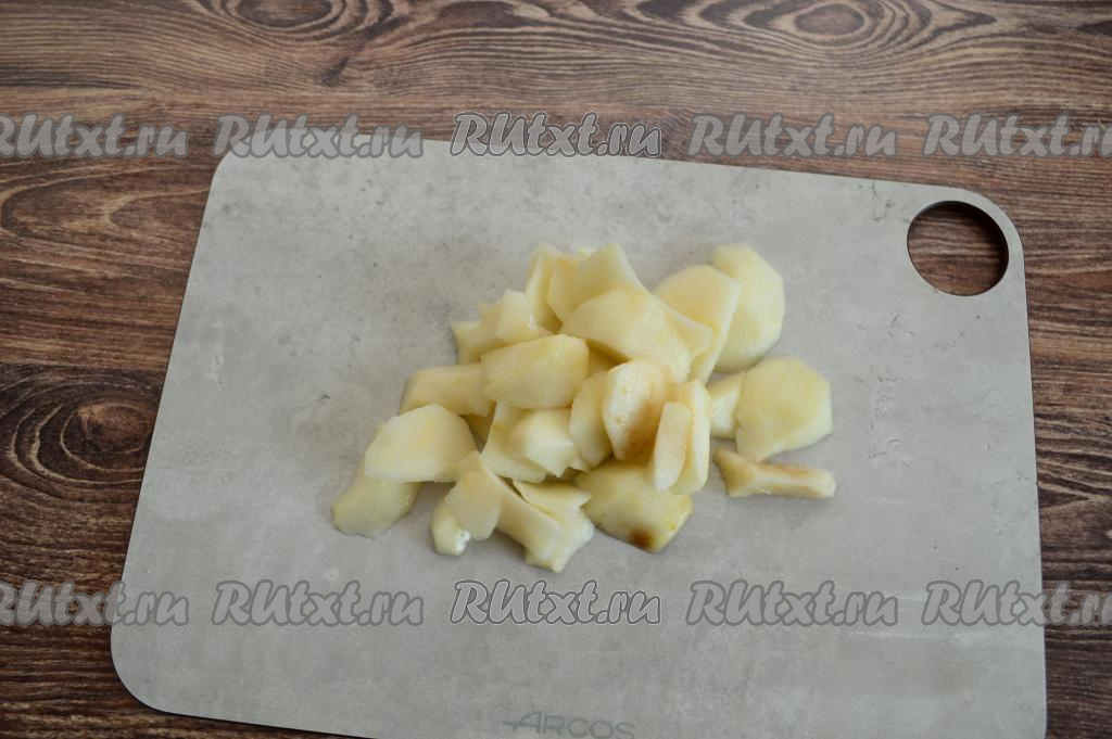 Грушу тоже очистить от кожуры, а затем нарезать на кусочки такого же размера, как было нарезано яблоко.