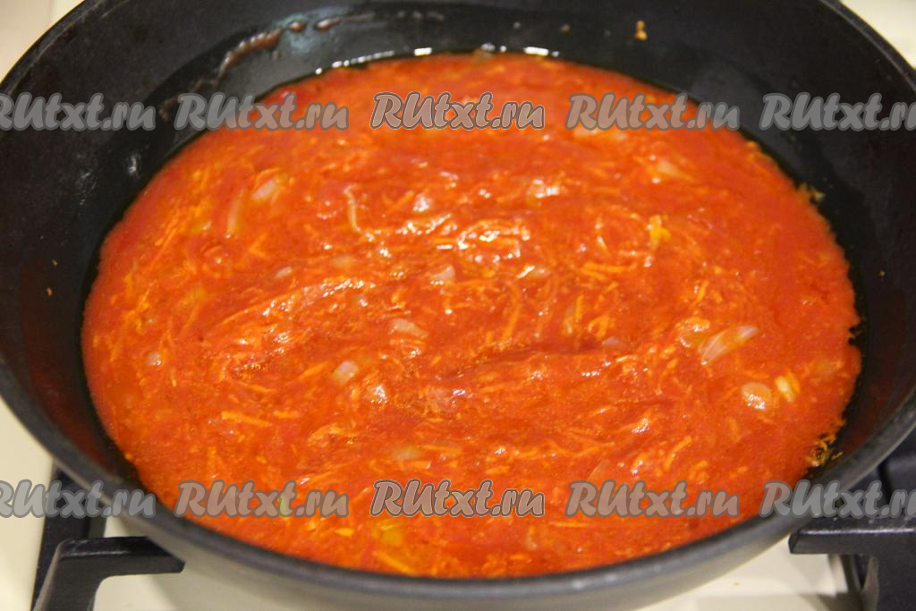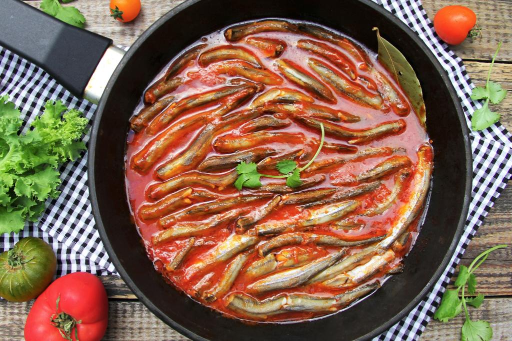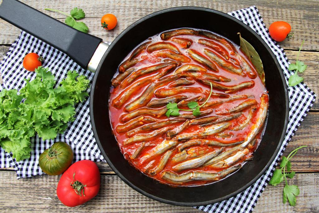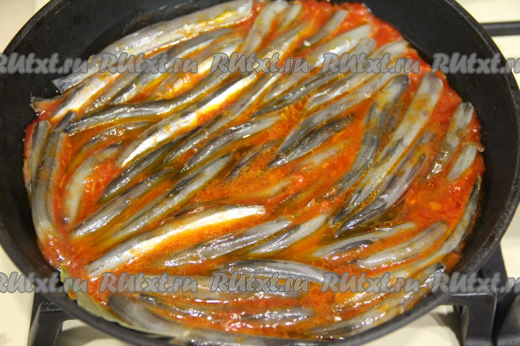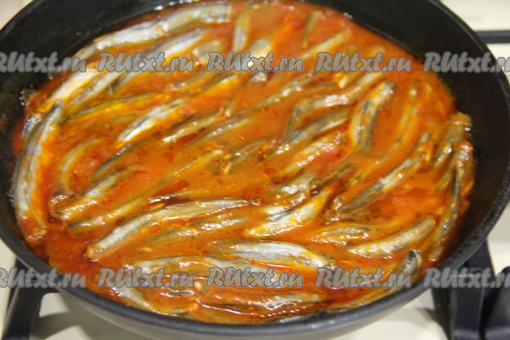 Накрыть сковороду крышкой, довести томатный соус до кипения, а затем, уменьшив огонь до минимума, тушить мойву 15 минут.