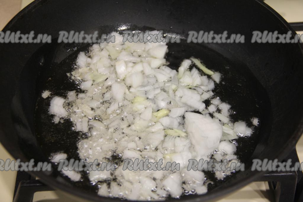 Лук мелко нарезать. В сковороду диаметром 22 сантиметра влить немного растительного масла, разогреть, выложить лук и обжарить его до прозрачности (в течение минут 5), иногда помешивая, на среднем огне.