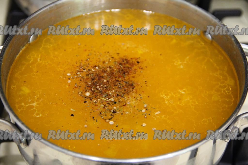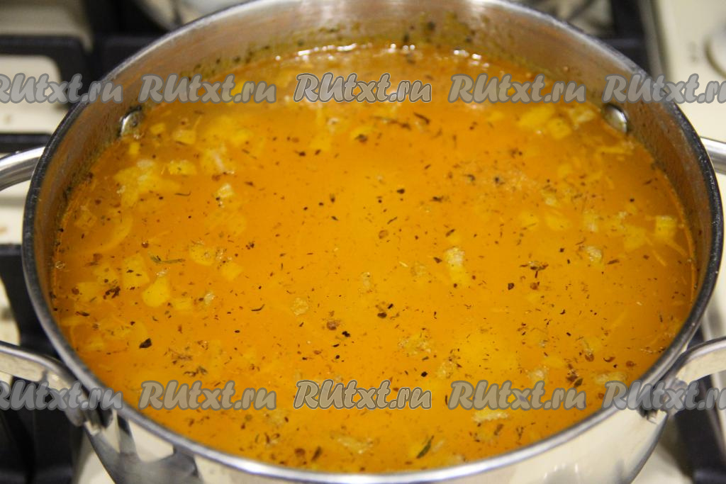 Рыбному супу с консервами, пшеном и картошкой дать закипеть, уменьшить огонь, посолить, приправить любимыми специями (я добавила смесь молотых перцев), варить 10 минут.