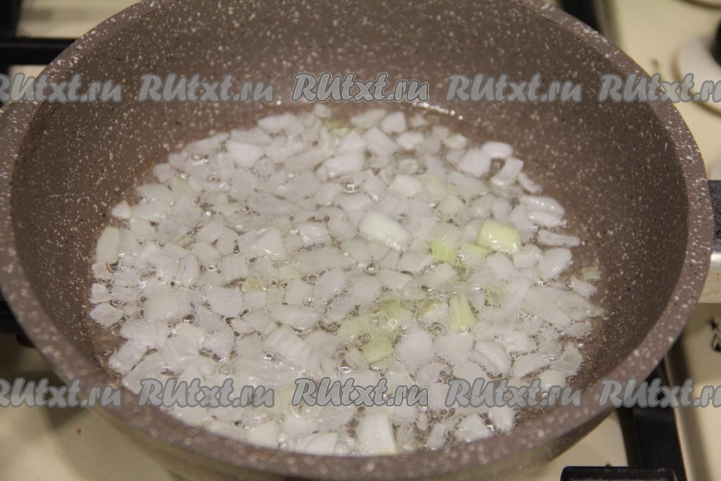Пока варятся картошка с пшеном, обжарим овощи для супа. Для этого в сковороде нужно хорошо прогреть растительное масло, после этого выложить мелко нарезанный лук и обжаривать его до прозрачности (минуты 3-4), периодически помешивая.