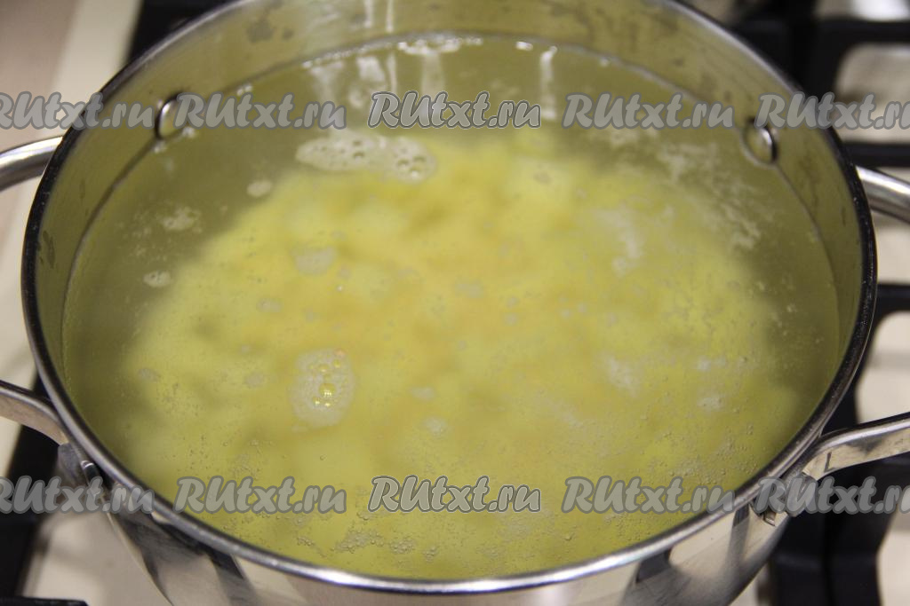 В кастрюлю с закипевшей водой выложить картошку и пшено, ещё раз дать закипеть и варить 10-15 минут на небольшом огне.