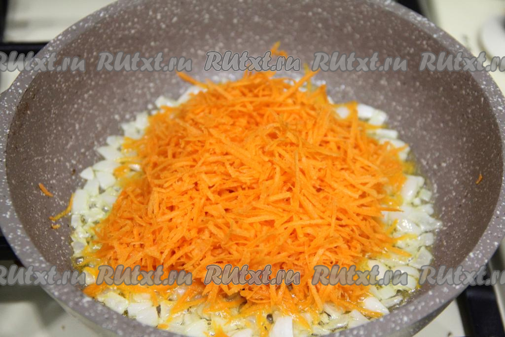 К обжаренному луку добавить морковку, натёртую на мелкой тёрке, перемешать и обжаривать овощи 4-5 минут (морковь должна стать мягкой), иногда помешивая.