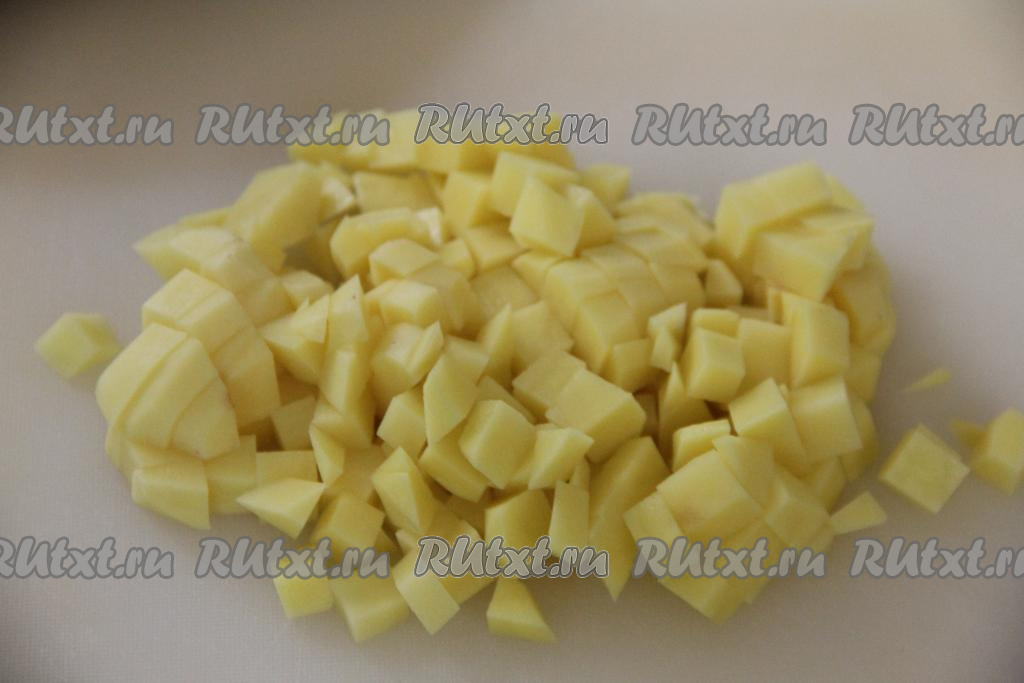 В кастрюлю влить 1,5 литра воды, поставить на огонь. Картошку нарезать на средние кубики.