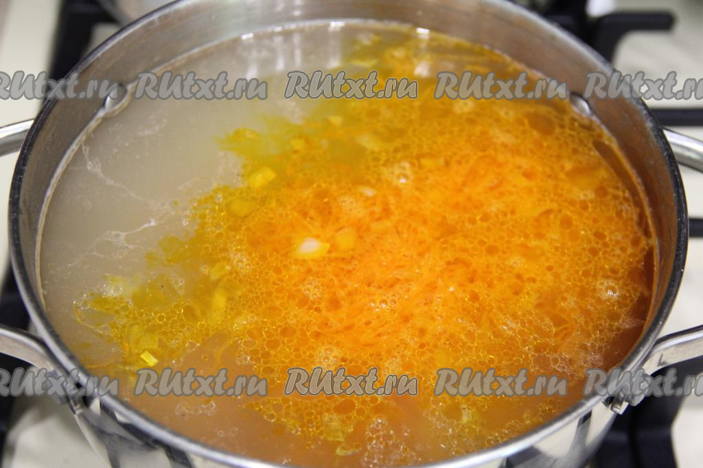 После того как картошка с пшеном проварятся с момента закипания 10-15 минут, добавить в кастрюлю обжаренные овощи.