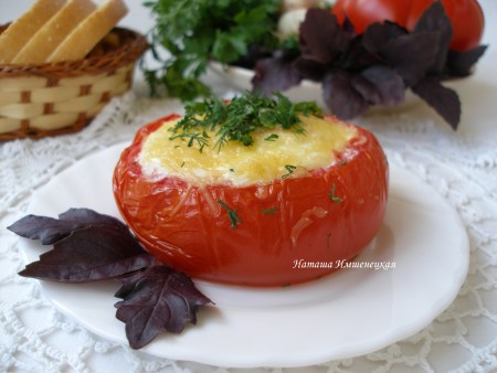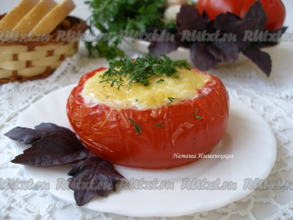 Через 20 минут яйцо должно запечься, вынуть помидоры из духовки и посыпать натертым сыром. Если кожица помидора треснула, ничего страшного, главное, чтобы не вытекло его содержимое. Поставить яичницу в помидоре в духовку еще на 5 минут, чтобы расплавился сыр.