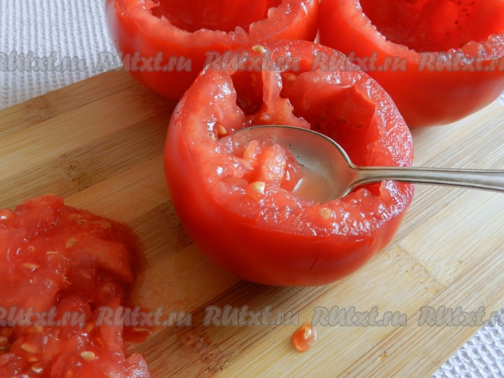 Помидоры вымыть, срезать верхушки и с помощью чайной ложки выбрать мякоть, оставляя толстыми стенки помидора. Помидоры для этого блюда лучше всего выбирать толстокожие.