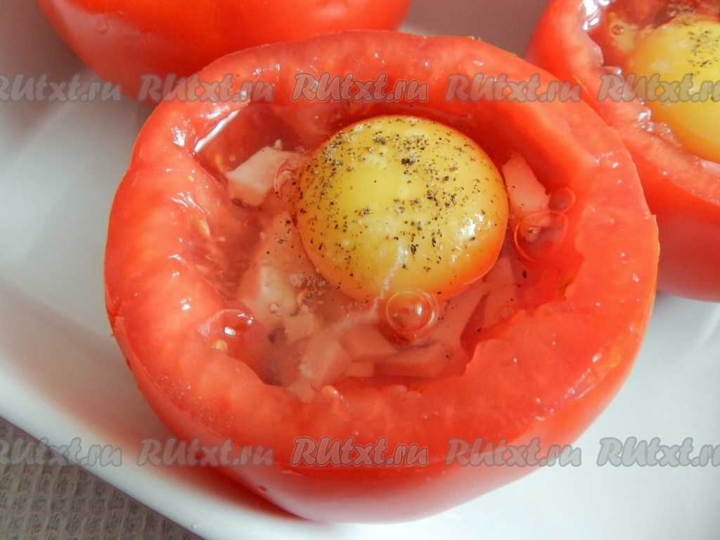 Аккуратно, чтобы не повредить желток, вбить в помидоры яйца, посолить, поперчить. Духовку разогреть до 190 градусов и запекать яичницу в помидоре 20 минут.