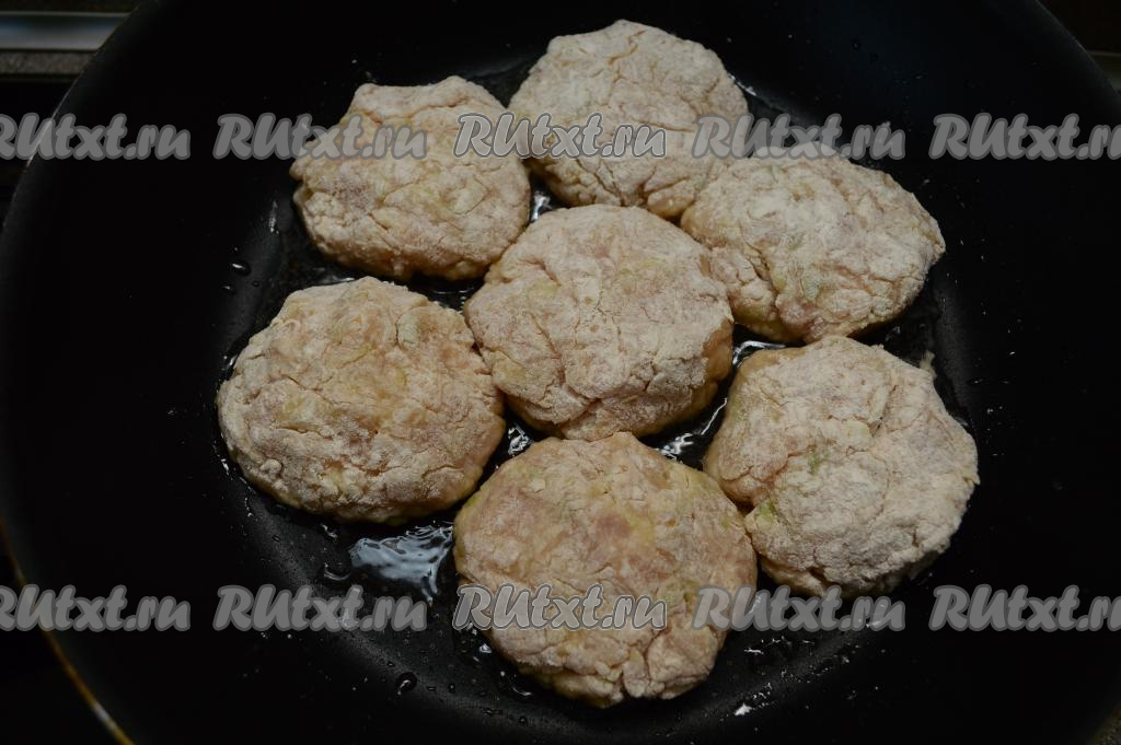 Сковороду хорошо разогреть с растительным маслом, затем уменьшить огонь до среднего, выложить котлеты и жарить их минут 5 (до румяной корочки снизу).