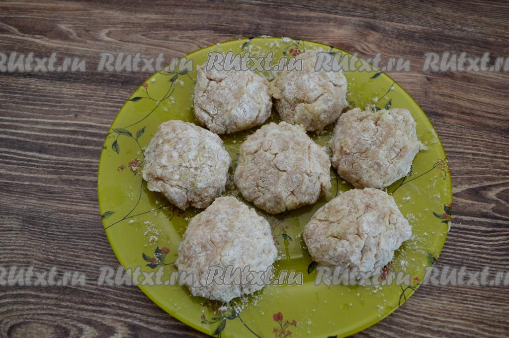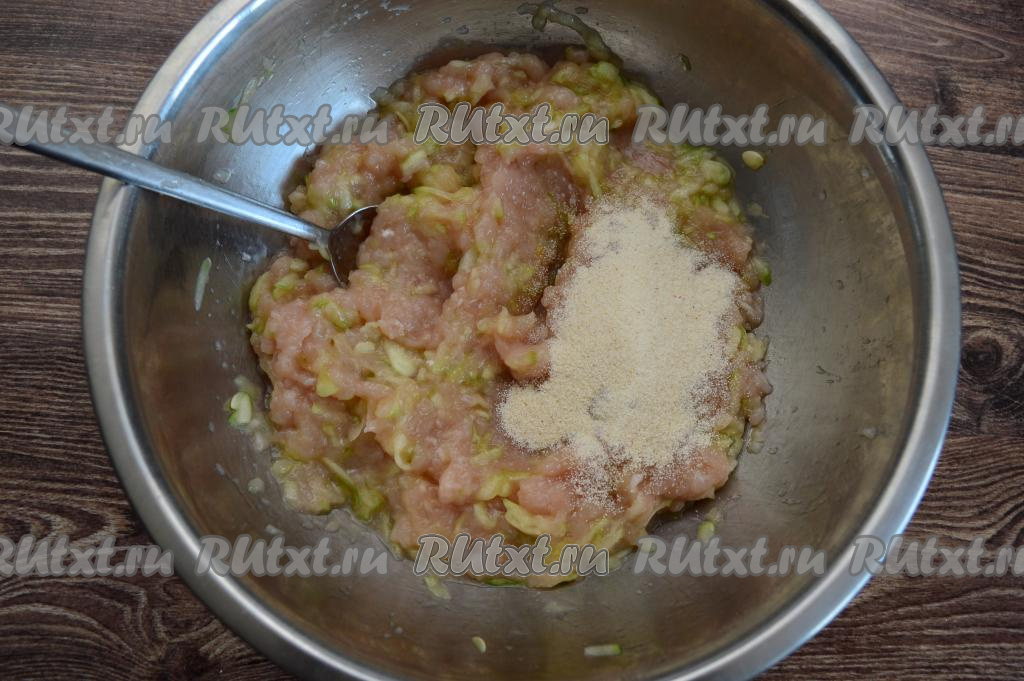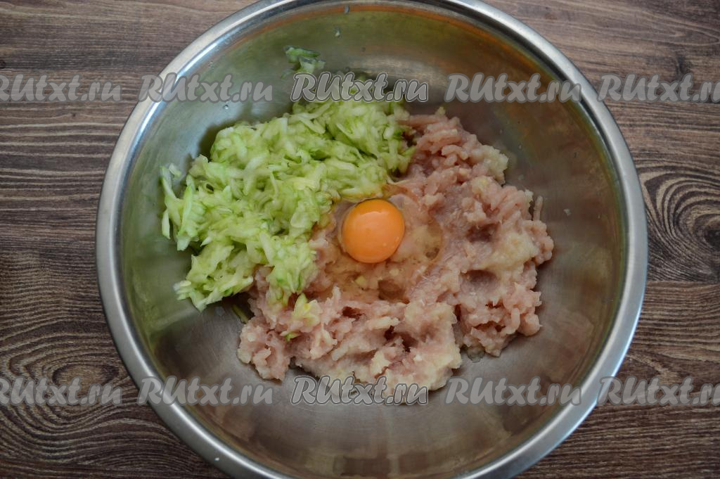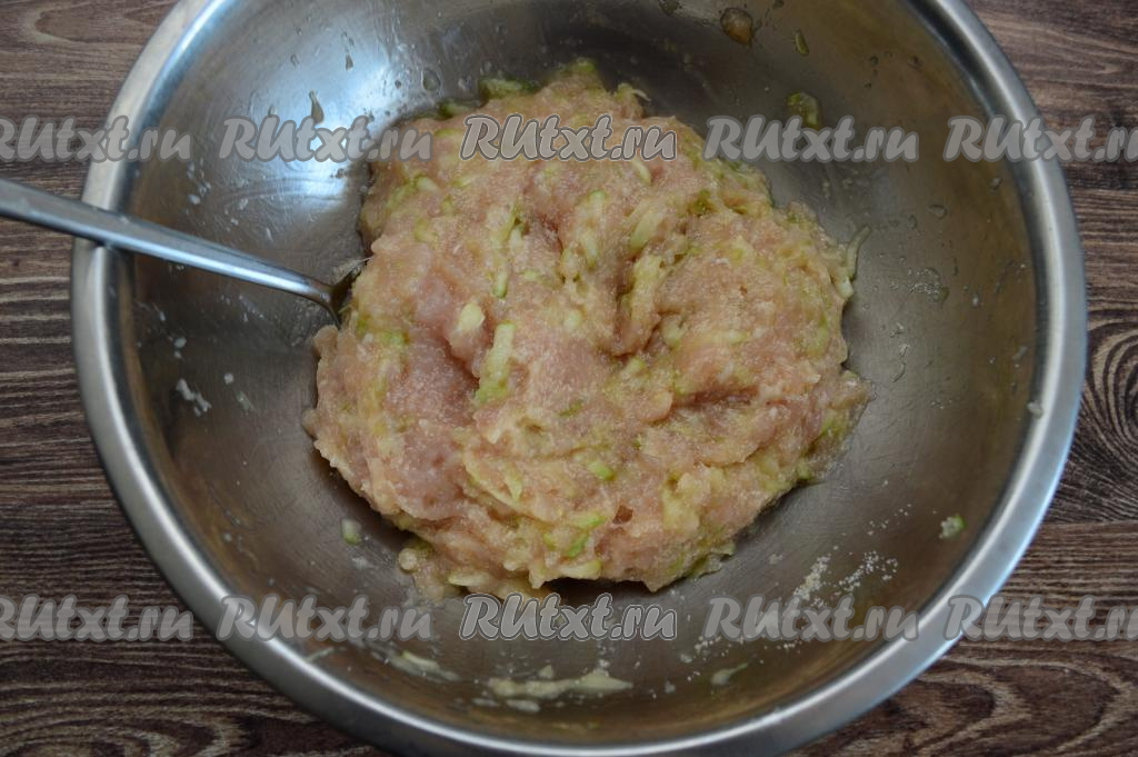 Курино-кабачковый фарш не должен быть сильно влажным, но при этом он получается не таким плотным, как обычный мясной, так как в нём есть кабачок. Оставить фарш на 5-10 минут, чтобы манка успела набухнуть.