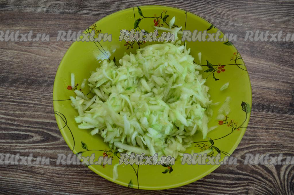 Кабачок очистить от кожуры, если есть крупные семечки, тогда мякоть с семенами надо удалить. Для приготовления котлет из 450 грамм мясного фарша потребуется около 250 грамм подготовленного кабачка. Натереть кабачок на крупной тёрке в глубокую тарелку, присолить и перемешать. Оставить натёртый кабачок на 5 минут, чтобы он выделил сок.
