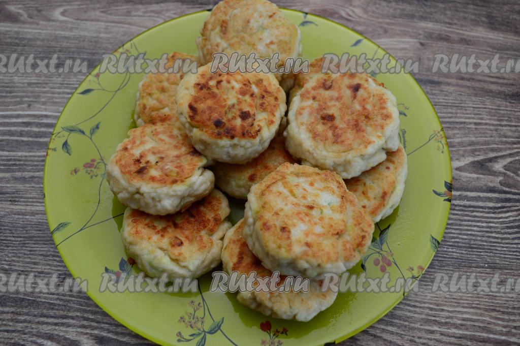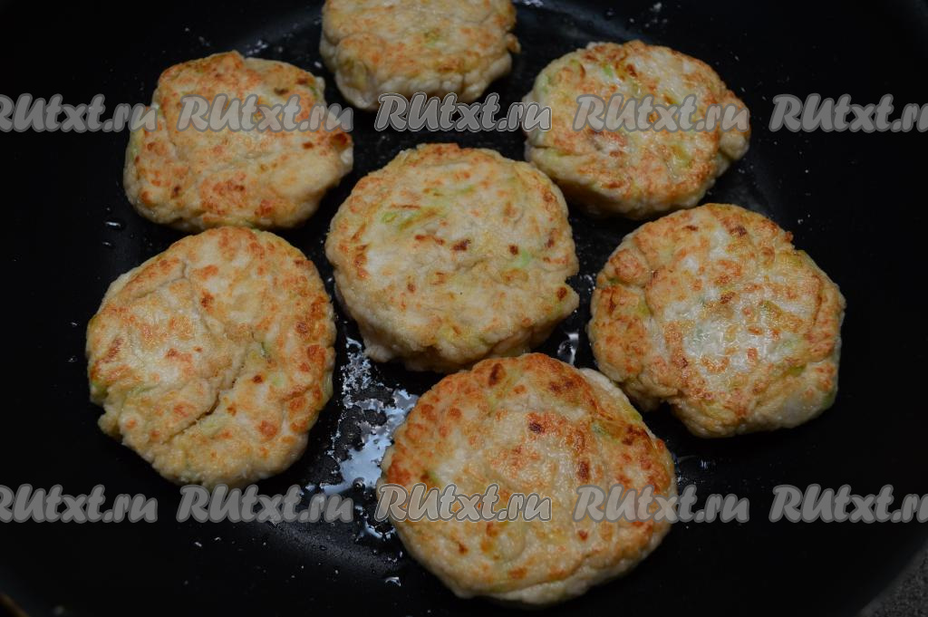 Затем курино-кабачковые котлеты перевернуть, накрыть сковороду крышкой, сделать огонь ниже среднего и обжаривать ещё 5 минут (до подрумянивания снизу). У меня все котлеты на сковороду не поместилась, я их жарила двумя партиями.