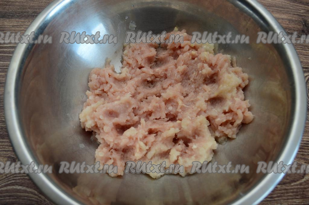 Куриное филе и очищенную луковицу пропустить через мясорубку в глубокую миску.