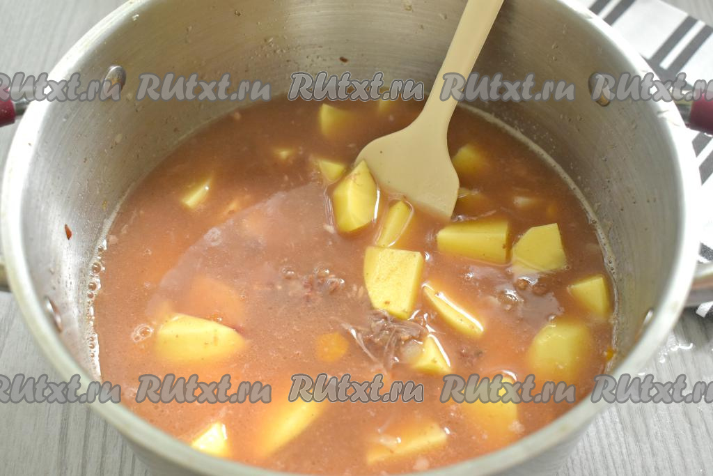 Почти полностью заливаем содержимое кастрюли водой, перемешиваем, доводим до кипения.