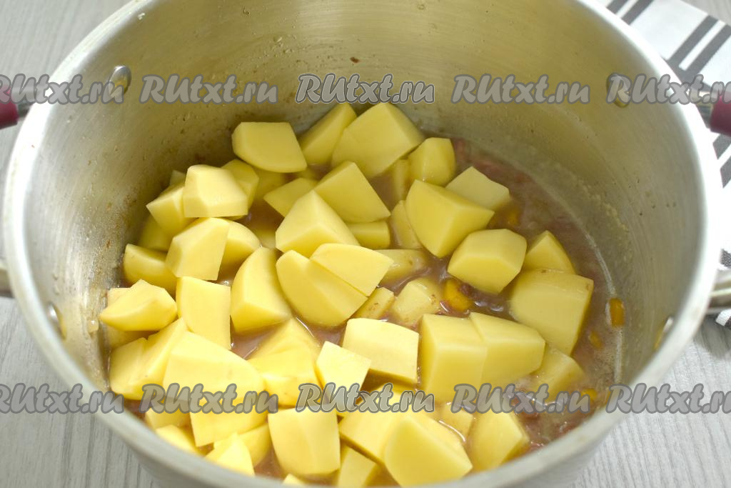 Картошку очищаем, нарезаем на средние кубики, выкладываем в кастрюлю с тушёнкой и овощами.
