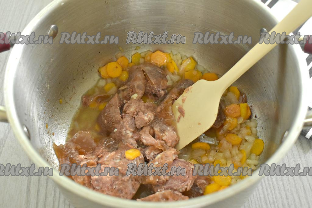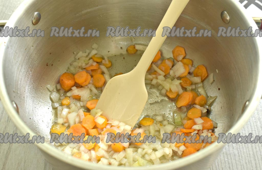 В кастрюлю с толстым дном (или в сковороду с высокими бортиками) выкладываем жир от тушёнки, ставим на огонь. Растапливаем жир, добавляем нарезанные лук с морковкой, обжариваем овощи на среднем огне 5 минут, периодически перемешивая. Если жира от тушёнки мало, тогда можно добавить 1 столовую ложку растительного масла.