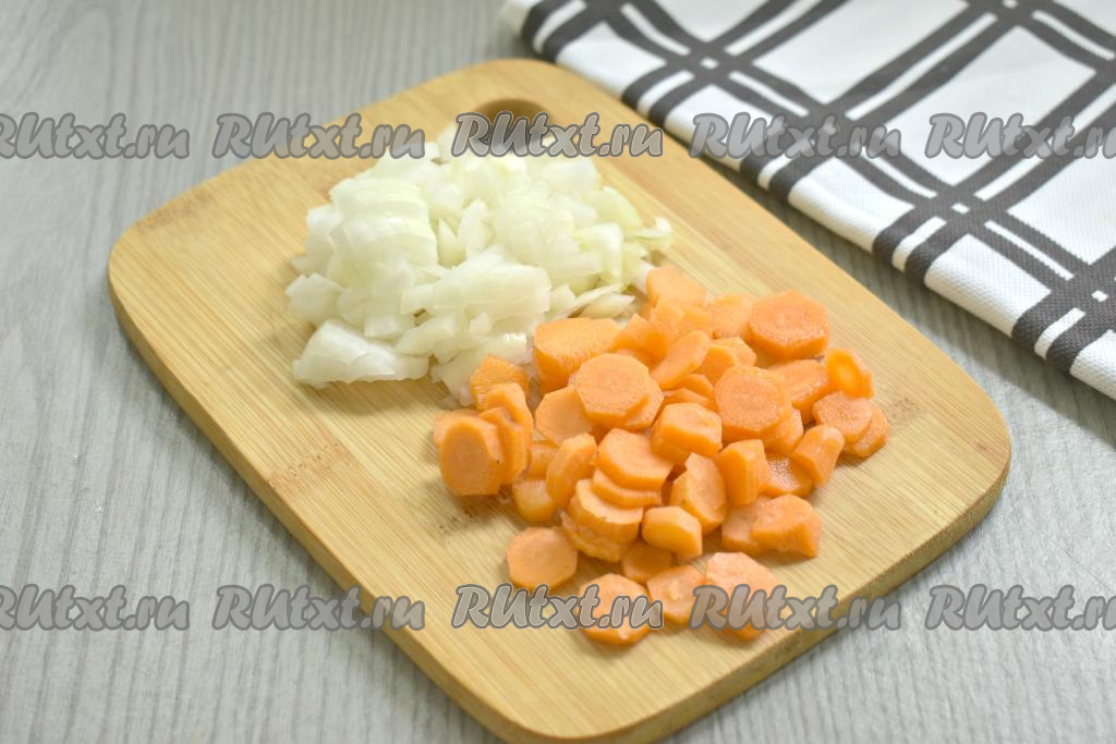 Очищаем лук и морковь. Лук нарезаем на небольшие кусочки, а морковь - на тонкие кружочки (или на полукружочки, или на брусочки).