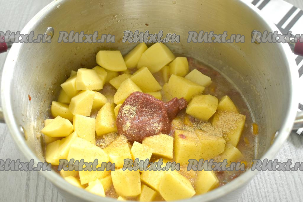 Добавляем томатную пасту, по вкусу солим, приправляем специями (в качестве специй я добавила готовую приправу для картофеля, но можно использовать свои любимые специи, например, молотый перец, паприку).