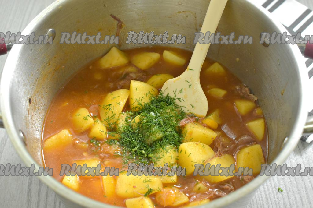 После закипания убавляем огонь и тушим картошку с тушёнкой и томатной пастой под крышкой 30 минут (до мягкости картофеля). Готовое блюдо посыпаем измельчённой свежей зеленью (у меня - укроп), перемешиваем и убираем с огня.
