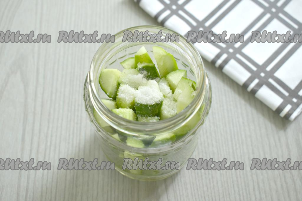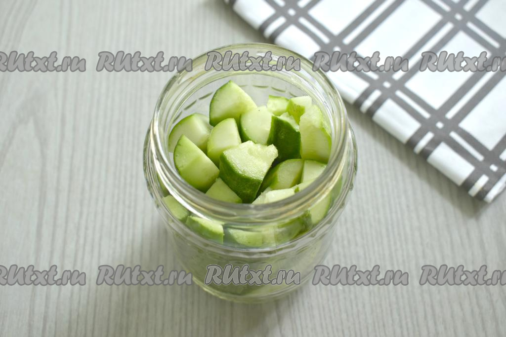 Заполняем плотно банку брусочками огурцов, ставя их вертикально.